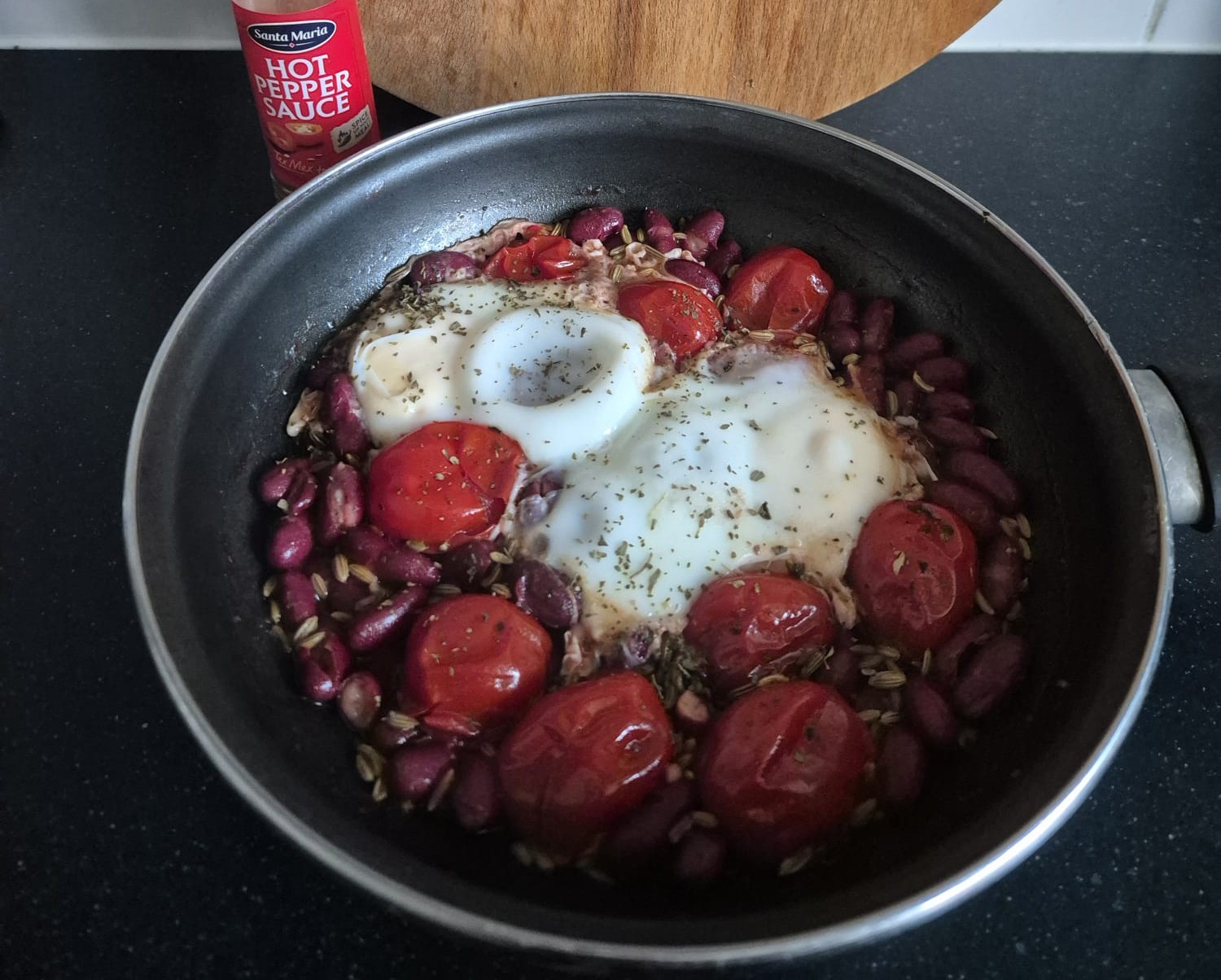 Kidneybonen met cherrytomaat en ei